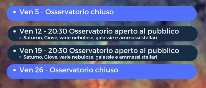 Ecco il calendario delle aperture dell’Osservatorio Astronomico di Piadera per il mese di Dicembre 2025. Gli oggetti da vedere sono moltissimi: ancora ben visibili Saturno, Nettuno, Urano e sempre meglio visibile il “gigante” Giove. Naturalmente le osservazioni non possono non rivolgersi verso la costellazione di Orione, la stupenda nebulosa M42 …